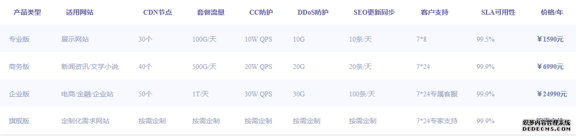 | 產(chǎn)品類型 | 適用網(wǎng)站 | CDN節(jié)點 | 套餐流量 | CC防護 | DDoS防護 | SEO更新同步 | 客戶支持 | SLA可用性 | 價格 |