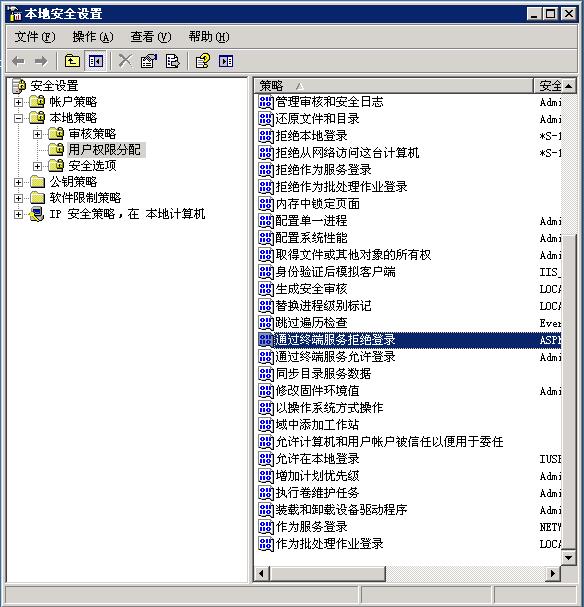 windows2003下禁止用戶遠(yuǎn)程登錄的方法 來源:夢飛科技 作者:夢飛 瀏覽量:214 2015-09-15 0 windows2003下禁止用戶遠(yuǎn)程登錄的方法如下: 打開控制面板 > 管理工具 > 本地安全策略 安全策略-->本地策略-->用戶權(quán)限分配-->通過終端服務(wù)拒絕登錄,在里面添加想要禁止遠(yuǎn)程的用戶可以達(dá)到讓這個賬戶無法遠(yuǎn)程